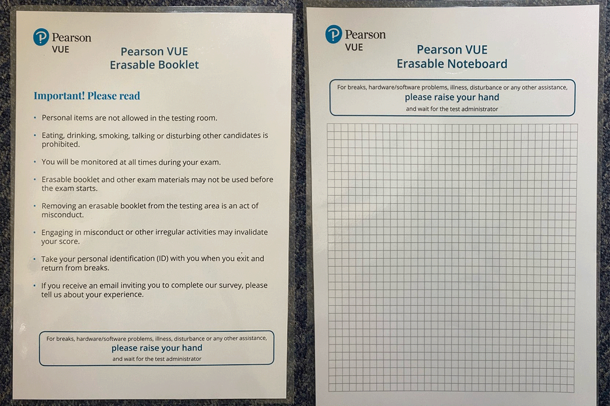 The Test Centre Administrator will offer you an erasable noteboard and pen, in order to take notes during your test. See examples below (click for larger version). No scratchpaper of any kind is permitted. Only one noteboard is permitted at any one time. If you fill the noteboard, do NOT attempt to erase the notes yourself - instead, raise your hand to alert the attention of the Administrator and request a replacement noteboard. The Administrator will provide a clean one and take away the used noteboard for cleaning. The noteboard must be handed back at the end of the test session.